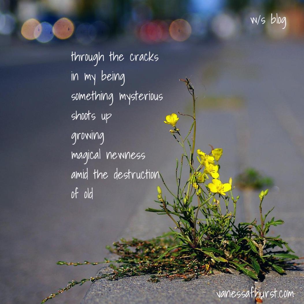 Something mysterious is shooting up through the cracks of my being letting me know that I am on the right track. In those openings I see the magical newness of growth amid the destruction of old. The old is crumbling into compost to nourish the new!